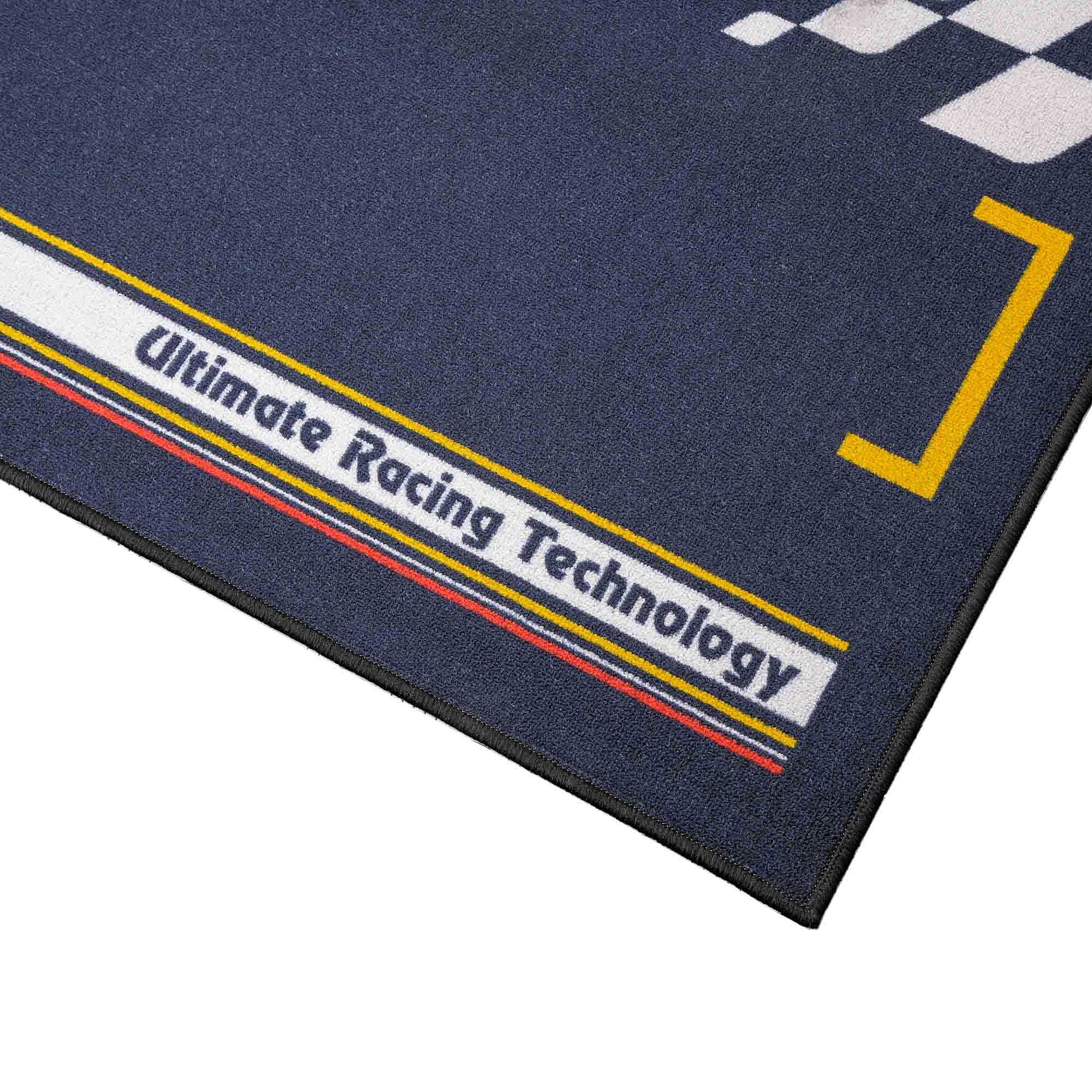 Nylon fibred garage and pit work mat with non-slip oil and water resistant PVC backing, as recommended by affiliated racing bodies.